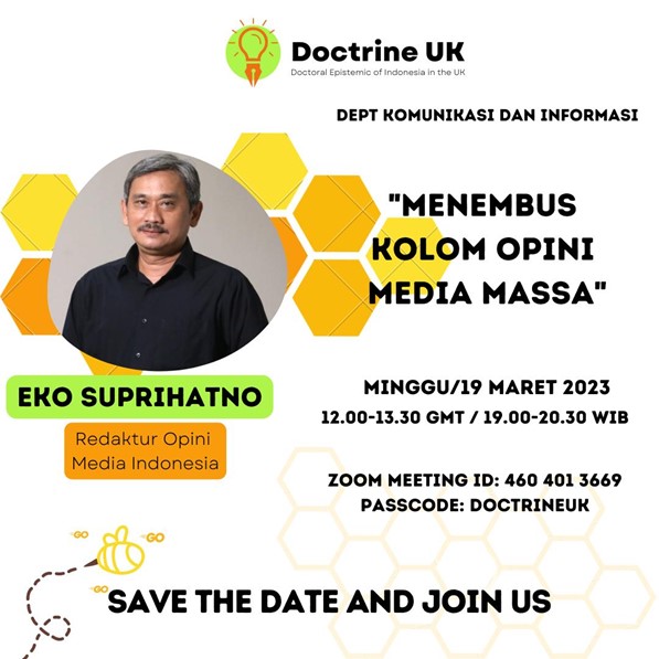 Menulis kolom opini media massa merupakan salah satu cara mahasiswa doktoral berbagi pengetahuan dan memberikan pencerahan ke masyarakat. Banyak pertanyaan terbersit, seperti tulisan apa yang dicari? Bagaimana sebuah tulisan ber peluang besar untuk dimuat? dan pastinya, apa ya tips ampuh untuk menembus kolom opini media massa Indonesia. Untuk menjawab pertanyaan-pertanyaan ini, Departemen Komunikasi dan Informasi, Doctrine UK melaksanakan kegiatan berjudul ‘Menembus kolom opini media massa’ yang dilaksanakan secara daring pada Minggu, 19 Maret 2023, pukul 12:30 – 14:30 GMT. Kegiatan ini menghadirkan narasumber, Eko Suprihatno, redaktur opini Media Indonesia yang sudah berkecimpung dalam dunia jurnalistik selama 30 tahun. Acara dipandu oleh Yohan Rubiyantoro, PhD Candidate in Educational Leadership, University of Nottingham. Berikut adalah ringkasan kegiatan secara garis besar, disertai dengan kodifikasi tanya dan jawab antara peserta dan narasumber.
