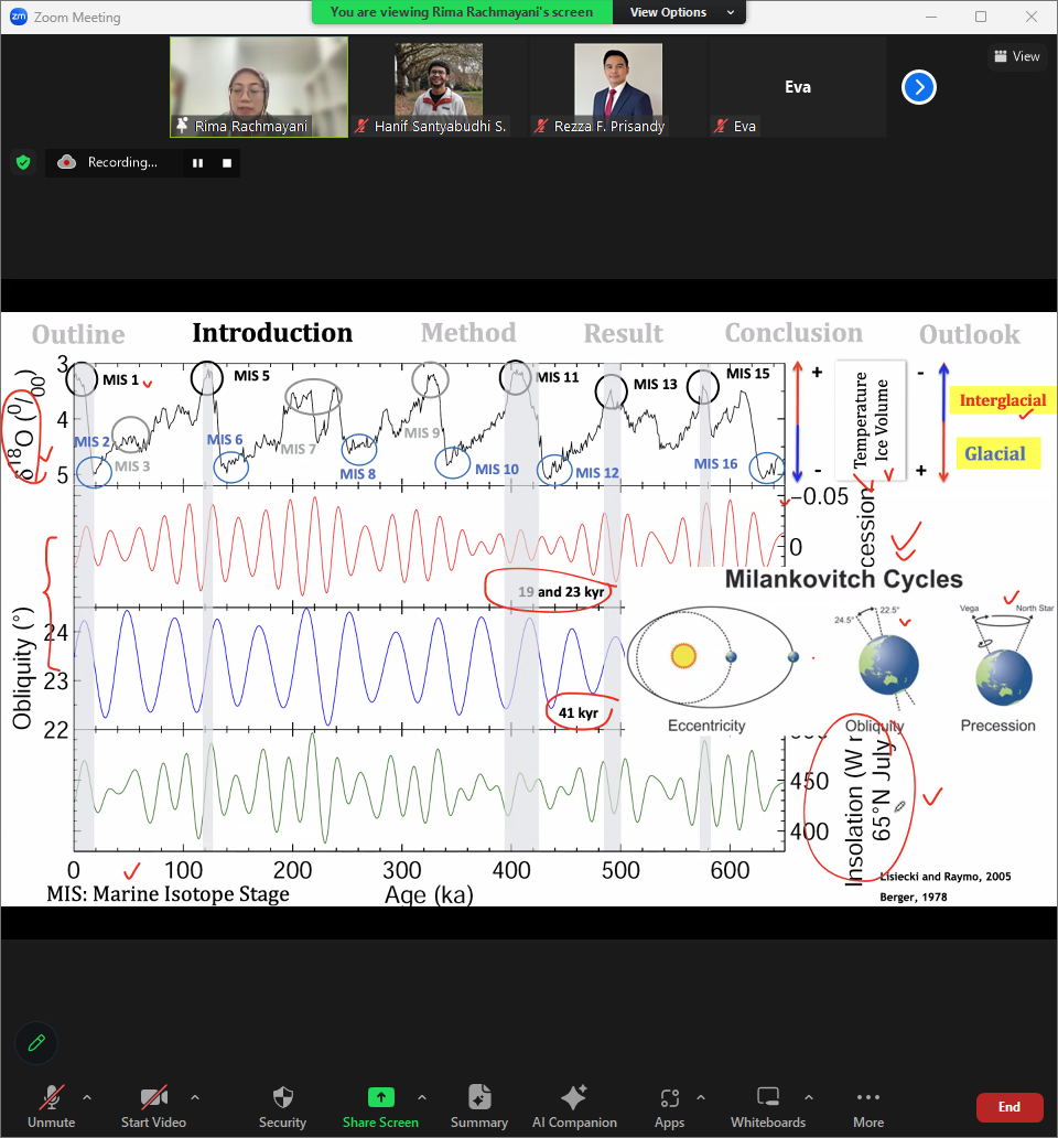 Dony mengangkat isu validasi model iklim, khususnya untuk wilayah Indonesia, dan relevansi temuan ilmiah bagi masyarakat umum. Validasi model iklim dapat dilakukan dengan membandingkan data model dengan local climate proxy (contoh kasus puncak es Jayawijaya), seperti isotop dari inti es. Hal ini penting untuk memperbaiki model iklim agar lebih akurat. Selain itu, Dony menekankan pentingnya mengkomunikasikan temuan ilmiah kepada publik. Edukasi iklim bisa dimulai dari hal sederhana, seperti memperkenalkan perbedaan emisi antara transportasi kereta dan pesawat. Selama pandemi, penurunan emisi karbon dioksida dari transportasi memberikan gambaran nyata tentang dampak perilaku manusia terhadap iklim.
