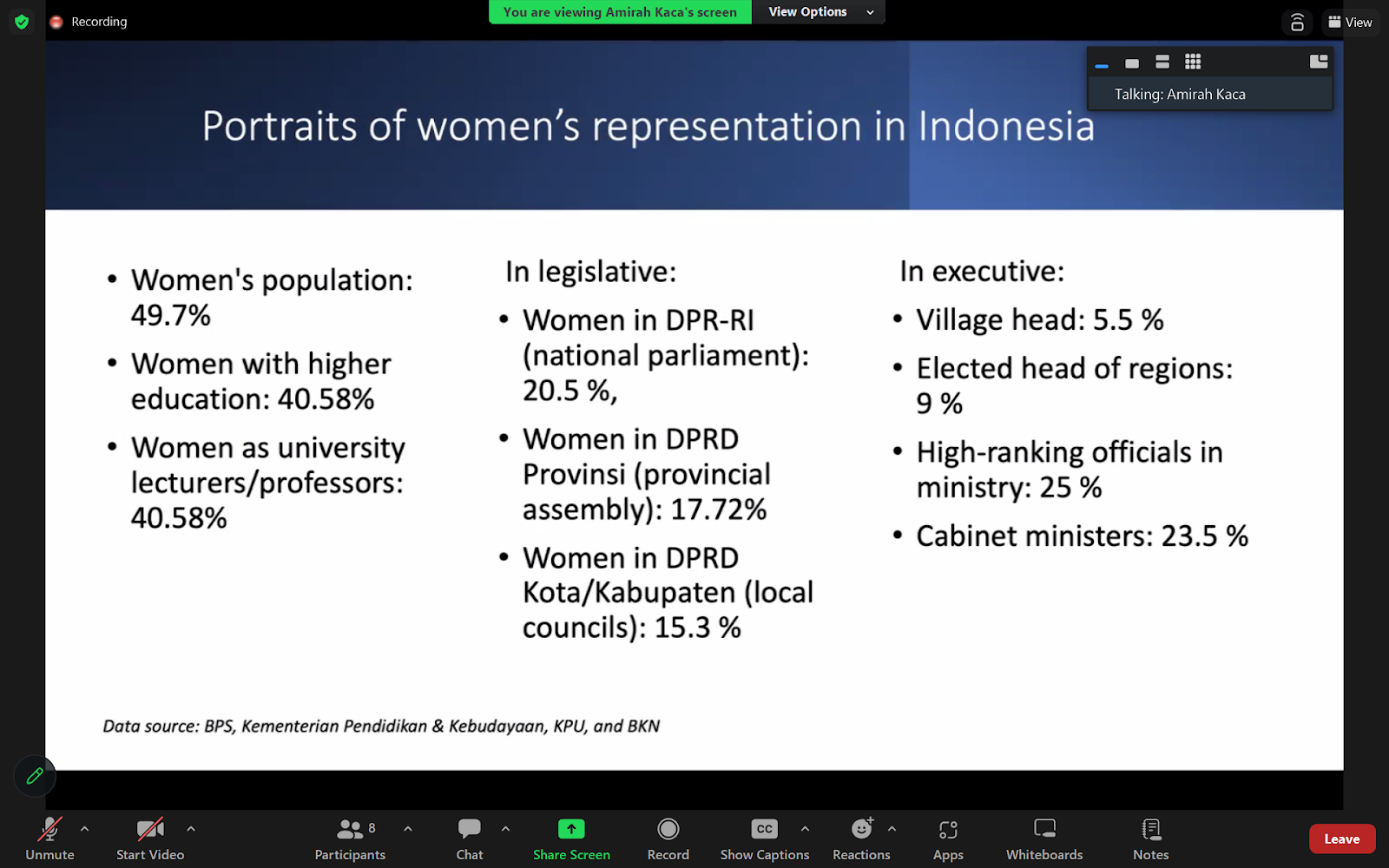 Penelitian Amirah berfokus pada refleksi pengalaman pribadi dan juga analisa hasil penelitiannya secara dengan menggunakan metodologi kuantitatif. Ia menjelaskan bahwa penelitiannya dilatarbelakangi oleh amanah Undang-Undang terkait batas minimal 30% representasi perempuan sebagai pelaku politik. Pertanyaannya, apakah demokrasi yang telah diatur secara prosedural juga telah terefleksikan secara substantif? Dengan kata lain, apakah keterwakilan perempuan benar-benar terwujud dengan adanya Undang-Undang yang mensyaratkan minimal partisipasi perempuan dalam dunia politik?